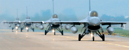 圖為韓國空軍KF-16戰斗機降落在第一戰斗飛行團跑道上,正前往停機場。