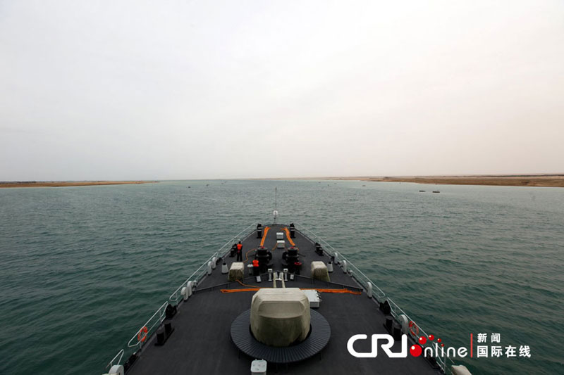 國際在線報道(記者王智達、曹金平):當地時間27日清晨6時(北京時間中午12時),執行“和諧使命——鄭和艦環球行”任務的中國海軍遠洋航海訓練艦“鄭和”艦,在埃方引水員引導下,緩緩駛入世界聞名的蘇伊士運河。圖為鄭和艦駛入蘇伊士運河 王智達攝