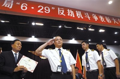 民航局在表彰大會上宣布,授予在“6·29”反劫機(jī)斗爭中發(fā)揮關(guān)鍵作用的安全員杜岳峰、徐洋和乘務(wù)長郭佳“中國民航反劫機(jī)英雄”榮譽稱號,為機(jī)長鄒勁松、副駕駛陳開元、楊海濤和乘務(wù)員呂慧、王婉鈺、宋佳分別記個人一等功,錄用安全員杜岳峰、徐洋為中國民航空中警察。