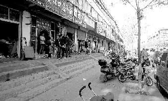 在潁河西路,道路兩側的機動車隨意停放,路面污水橫流、垃圾到處都是,路南側的商戶更是將非機動車道全部占用。