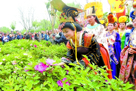 將軍護駕、宮女旁侍。4月14日,“武則天”居然“穿越”到洛陽中國國花園,游園踏青、觀賞牡丹。原來,這是第30屆中國洛陽牡丹文化節期間舉行的一場大型藝術表演。 首席記者 陳曉東 圖