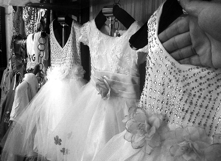 “這個送珍珠腰帶,走(賣)得可好,帶一件吧!”昨天下午2點,鄭州市豐產路某店鋪內,女老板正在向一位女士推銷熱賣的“公主裙”。仔細看,這條粉紅色的裙子,腰間綴著由花生米大小的“珍珠”做的腰帶,袖口邊緣處還貼著亮閃閃的貼片,看著確實華麗。經過一番討價還價,該女士花100元為上幼兒園的女兒買了條裙子。令她不滿意的地方,就是似乎珍珠腰帶縫得并不緊,“珍珠是一根單線穿下來的,穿不了幾次,就該斷了”。
