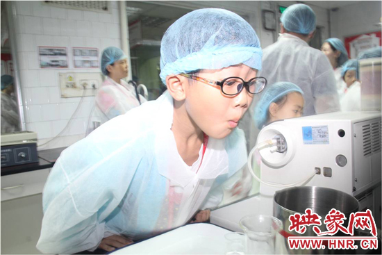 穿上白色的參觀服、戴上一次性帽子,受邀家庭進入了檢測區,參觀了質量控制的檢測工作流程。正在工作的品控員,現場邀請了一名小朋友進行了其中一項檢測--白利度檢測?!昂唵蝸碇v,就是利用密度儀,測試一瓶飲料的糖度和含氣量兩個指標?!逼房貑T張青介紹道。