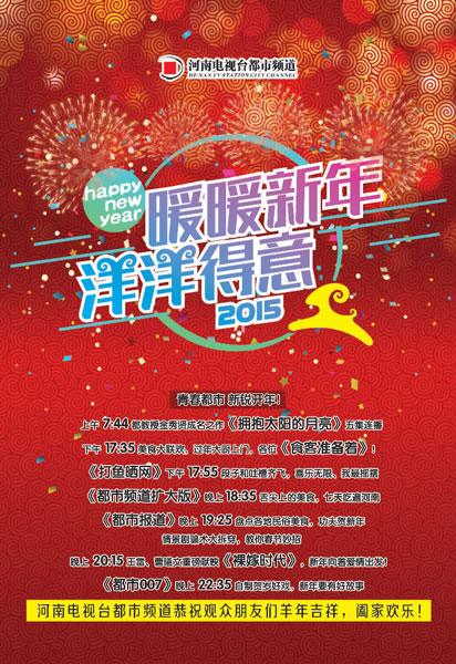 《都市007》將推出兩部賀歲劇,這兩部劇均有頻道著名主持人參與演出,將在除夕到正月十五期間播出。《打魚曬網(wǎng)》繼續(xù)圍繞歡樂的主題,播出以爆笑方言神劇和家庭幽默錄像為主的開心劇場,以看電影找樂子為主的電影吐槽系列。《食客準(zhǔn)備著》繼續(xù)為觀眾找好吃的、教觀眾做好吃的,圍繞“春節(jié)”這一主題大做文章,打造“食客迎春”和“食客春節(jié)”兩大節(jié)目帶。