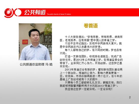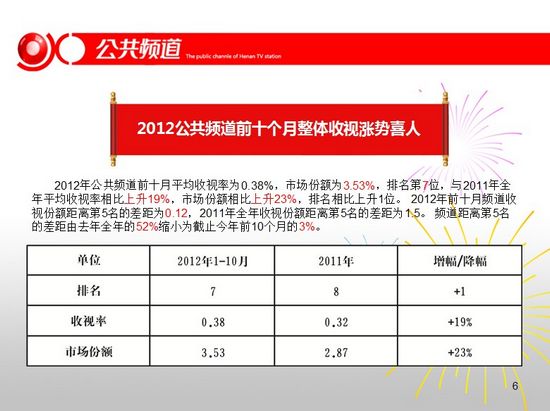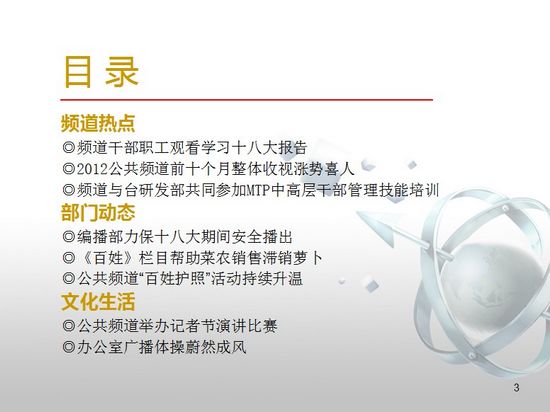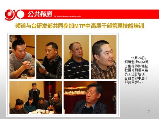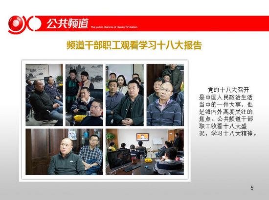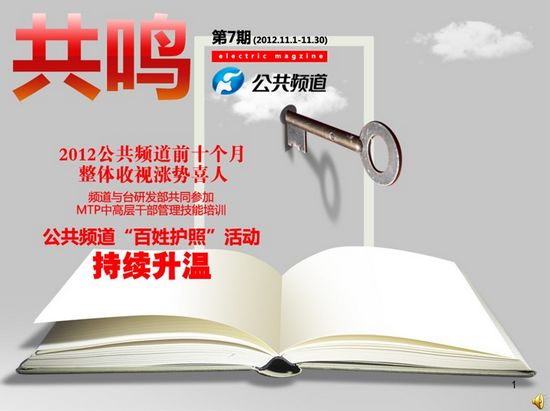 頻道干部職工觀看學習十八大報告,2012公共頻道前十個月整體收視漲勢喜人,頻道與臺研發部共同參加MTP中高層干部管理技能培訓。