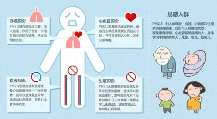 霧霾天由于紫外線照射不足,人體內維生素D生成不足,易產生精神懶散、情緒低落等現象,還可能導致缺鈣。美國一項結果顯示,生活在空氣污染較為嚴重的環境下的孕媽,他們娩出的寶寶出生體重降低9%,頭圍數減少2%,對比空氣相對較好的孕媽們娩出的寶寶則沒有明顯的變化。研究表明,空氣污染對胎兒的低出生體重和小頭圍有關,環境污染對胎兒生長構成威脅。綠色和平組織發布的有關PM2.5對人體危害的警告:PM2.5上附著很多重金屬及多環芳烴等有害物,造成孕婦胎盤有毒性,易導致胎兒宮內發育遲緩和低出生體重;毒物還可以通過胎盤,直接毒害胎兒,特別是妊娠早期。