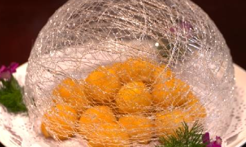 宛如藝術品一般的金玉滿堂,一上桌就抓人眼球。真正體現了店家精益求精,精雕細琢的態度。融化的冰糖織就像銀絲穹頂,覆蓋在“金球”之上使整道菜更添一絲朦朧。拿出一顆金黃的山藥球,咬開脆皮一股奶香便充斥口腔,奶香散盡后山藥泥的甘甜軟糯便呈現出來,滿口生津卻又香而不膩,非常適合女士。