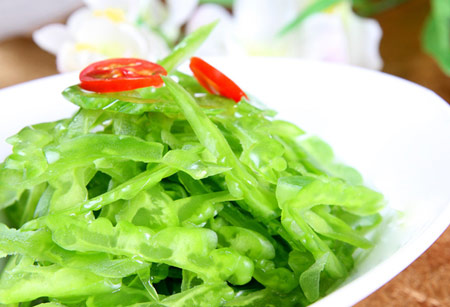 苦瓜可炒食、煮食或蒸食,清苦爽口,先苦后甜,口味長久。如將苦瓜和辣椒同炒,可減輕苦味。將其切成薄片,然后在上面灑上一些鹽漬。一會兒,再用水把鹽濾掉;也可以把苦瓜切成塊,然后煮熟,放進冷水中浸泡,這樣苦瓜的苦味就會減少許多。