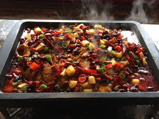 4、用青紅辣椒,蔥姜蒜,以及料酒,紅油,鹽,少量雞精調味,爆炒制作湯汁和配料,澆到之前烤好的鮰魚上。