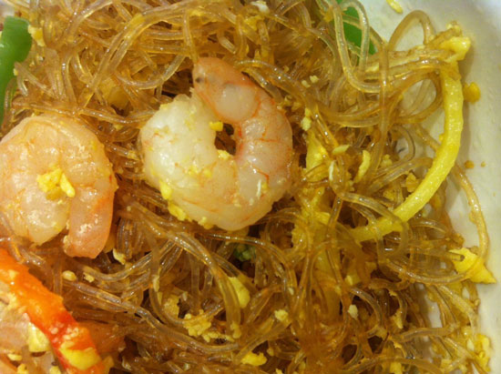 4、粉絲鍋中炒干后放入炒制好的蝦仁和雞蛋碎調味加入雞粉、鹽、味精翻炒均勻即可。