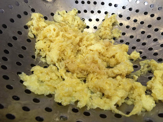 你知道名菜桂花廣肚中的桂花是怎么制作出來的嗎?就是圖中的操作,炸蛋液!這樣出來的雞蛋金黃色一絲絲的很像八月的桂花。可是李大師的“桂花”并不是與廣肚搭配,它要搭配的是---手撕大白菜!