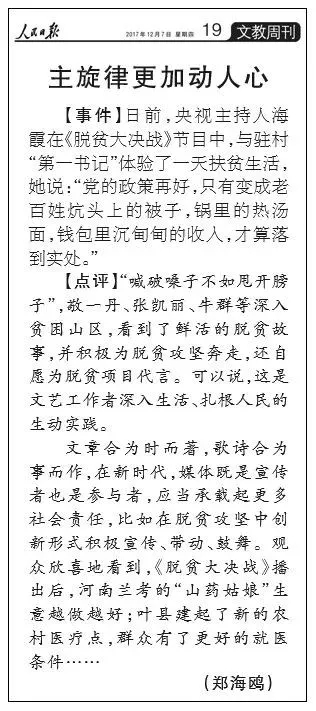 評論中還指出,文章合為時(shí)而著,歌詩合為事而作,在新時(shí)代,媒體既是宣傳者也是參與者,應(yīng)當(dāng)承載起更多社會(huì)責(zé)任,比如在脫貧攻堅(jiān)中創(chuàng)新形式積極宣傳、帶動(dòng)、鼓舞。觀眾欣喜地看到,《脫貧大決戰(zhàn)》播出后,河南蘭考的“山藥姑娘”生意越做越好;葉縣建起了新的農(nóng)村醫(yī)療點(diǎn),群眾有了更好的就醫(yī)條件……
