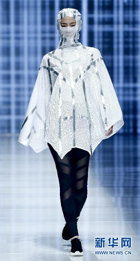 10月28日,模特在北京舉行的中國國際時裝周“喬丹·尹鵬運動裝發布會”上,展示設計師尹鵬設計的搭配各種“口罩”的運動裝。新華社記者陳建力攝