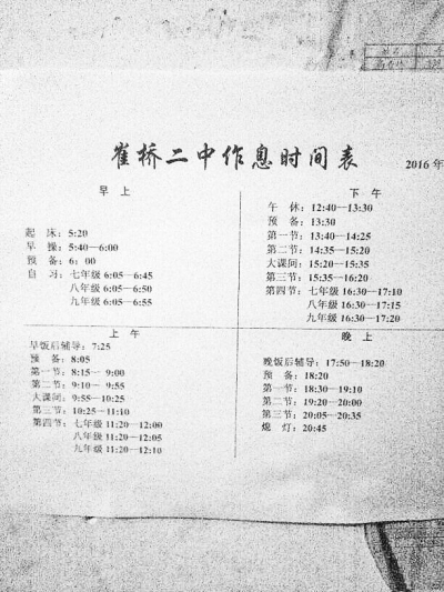 悲痛之余,佳佳的伯伯質疑學校規定的作息時間存在不合理狀況。記者從其提供的該校作息時間表上看到,該校針對所有學生規定的早上起床時間是凌晨5時20分,早操是5時40分至6時整,然后是早自習。